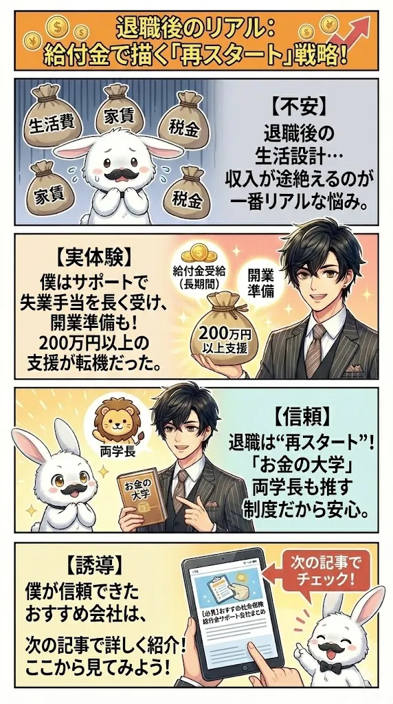 • 退職後の社会保険給付金を活用:失業保険、傷病手当金、再就職手当など、経済的に困らないための制度を理解しておくと安心です。