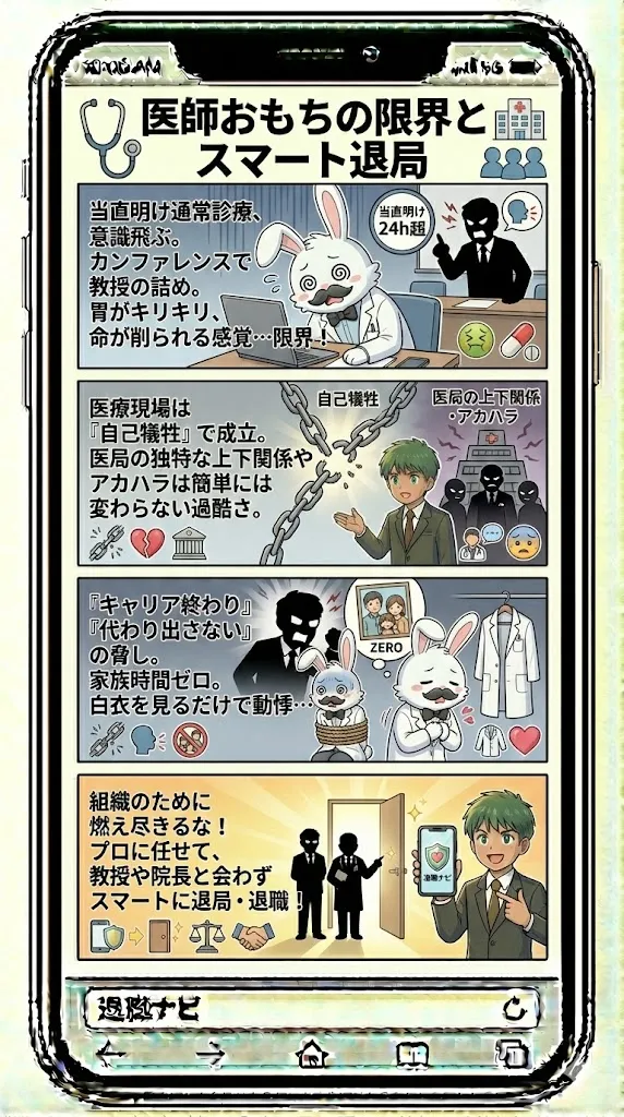 - 医局の引き止めや報復が怖いなら、弁護士運営の退職代行で安全に離脱する。