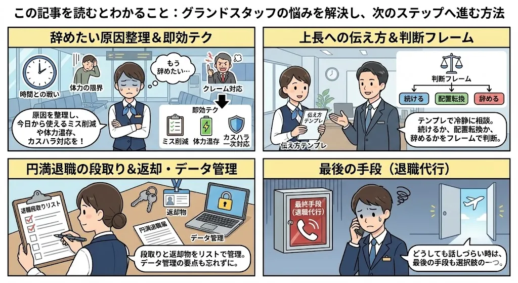 グランドスタッフの仕事は、航空の最前線でやりがいがある一方、時間との戦い・体力の限界・クレーム対応のストレスなど、厳しい現場でもあります。フライトスケジュールに左右される勤務や人員不足の中で、「もう辞めたい」と感じるのは自然なことです。
