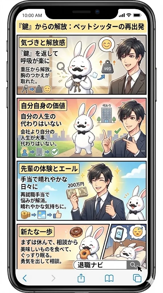 ある飼い主から「毛が一本落ちていた」「前日より元気がない気がする」と毎日何時間も電話で説教をされていたAさん。会社に相談しても「お客様だから我慢して」と言われるだけ。ついには家から出られなくなり退職代行を依頼。代行会社が鍵の返却手順まで全て仲介し、翌日から二度とその飼い主とも会社とも関わらずに済みました。