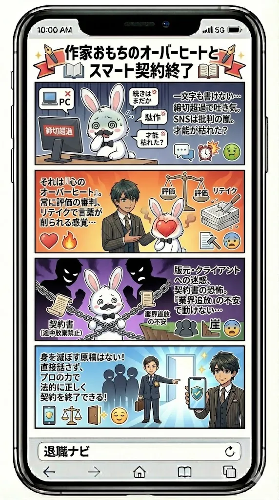 - 版元やクライアントとのしがらみが怖いなら、弁護士運営の退職代行ですべて解決する。