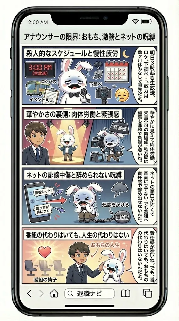 帯番組を担当すれば、生活リズムは完全に崩壊します。午前2時に起床し、喉のコンディションを整え、生放送に臨む。放送後も反省会や取材、ナレーション収録が続く。この極限状態の生活が数年続けば、自律神経を病むのはむしろ当然の反応です。