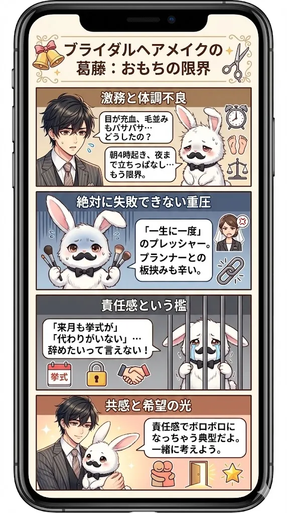 「人生で一番綺麗でありたい」という新婦様の期待に応え続けるのは並大抵のことではありません。当日の急な要望変更や、こだわりが強いお客様からの厳しい指摘。一ミリの妥協も許されない環境での仕事は、精神を極限まで削り取ります。