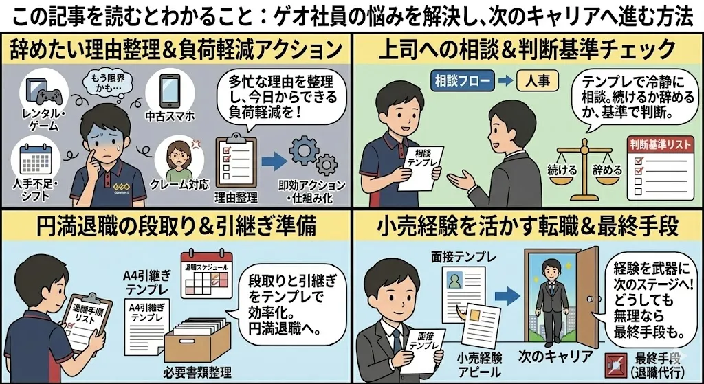 この記事では、ゲオ社員が辞めたいと感じやすい理由の整理から、今日から実践できる現場での対処法、上司や人事への伝え方テンプレート、続けるか辞めるかの判断基準、円満退職の段取りまでを実務的に解説します。さらに、社員とアルバイトの違いを踏まえた転職戦略も紹介。どうしても改善が難しい場合に備え、最後の手段(退職代行)の見出しも用意しています。焦らず、安全にキャリアを立て直すための一歩をサポートします。
