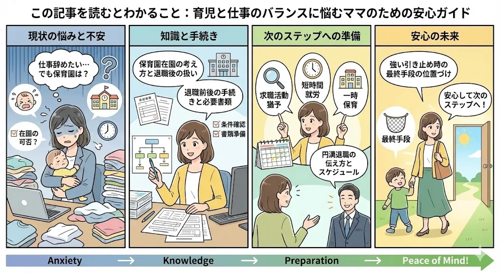 仕事と育児の両立に限界を感じ、「仕事を辞めたい」と思ったとき、多くのママが最初に不安に思うのが「保育園に子どもを預け続けられるのか?」という点です。実際、在園の可否は自治体の基準や手続きのタイミングによって変わるため、焦って判断すると後悔することもあります。