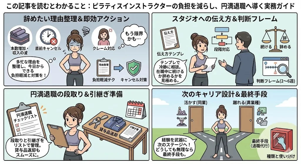 ピラティスインストラクターの仕事は、レッスンの充実感やお客様とのつながりが魅力的である一方で、本数の増加・収入の波・直前キャンセル・クレーム対応・ケガのリスクなど、心身に大きな負担がかかる仕事でもあります。好きだからこそ無理をしてしまいがちですが、限界を超える前に現実的な対処が必要です。