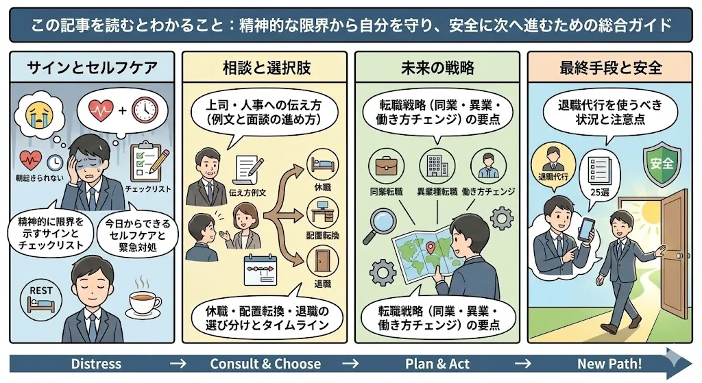 この記事では、精神的限界を示すサインとセルフチェックリストから、今日からできるセルフケアと緊急対処法、上司や人事への伝え方テンプレートまでを具体的に解説。さらに、休職・配置転換・退職の選び分け方と実務タイムライン、そして回復後の転職・働き方チェンジの戦略も紹介します。最後に、どうしても言い出せない場合の退職代行会社25選も掲載。焦らず、安全に次のステップへ進むための総合ガイドです。
