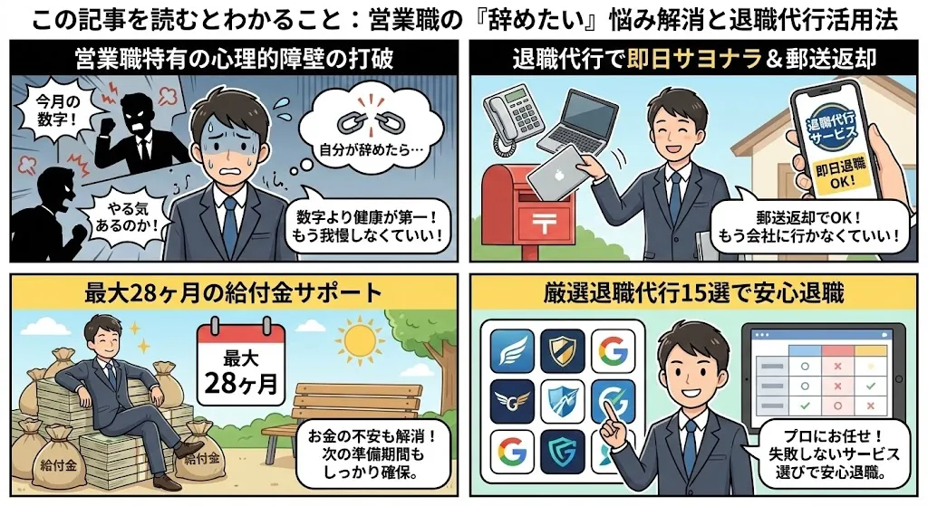 - 営業職の「辞められない」悩みは、退職代行で即日解消できる。