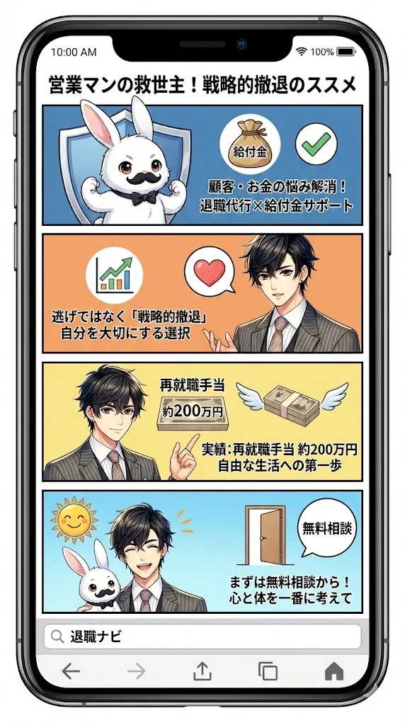 - 営業職の「辞められない」悩みは、退職代行で即日解消できる。
