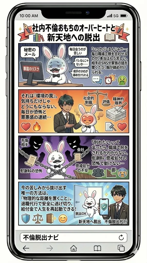 この記事では、社内不倫を終わらせるべき正当な理由と、最悪の事態(慰謝料・懲戒処分)を回避する具体的なステップ、そして精神的な限界を迎えた方が「退職代行」を使って人生を再起動させる方法を詳しく解説します。