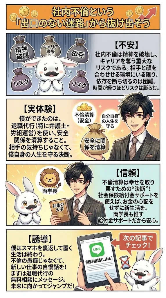 僕はかつて、ブラック企業で心身を削り、将来への不安から動けなくなっていた時期がありました。しかし、社会保険給付金サポートを活用して経済的な基盤を確保したことで、ようやく「自分を大切にする道」を選べました。不倫というデリケートな問題も、本質は同じです。「環境を強制的に変えること」こそが、あなたを救う最大の武器になります。