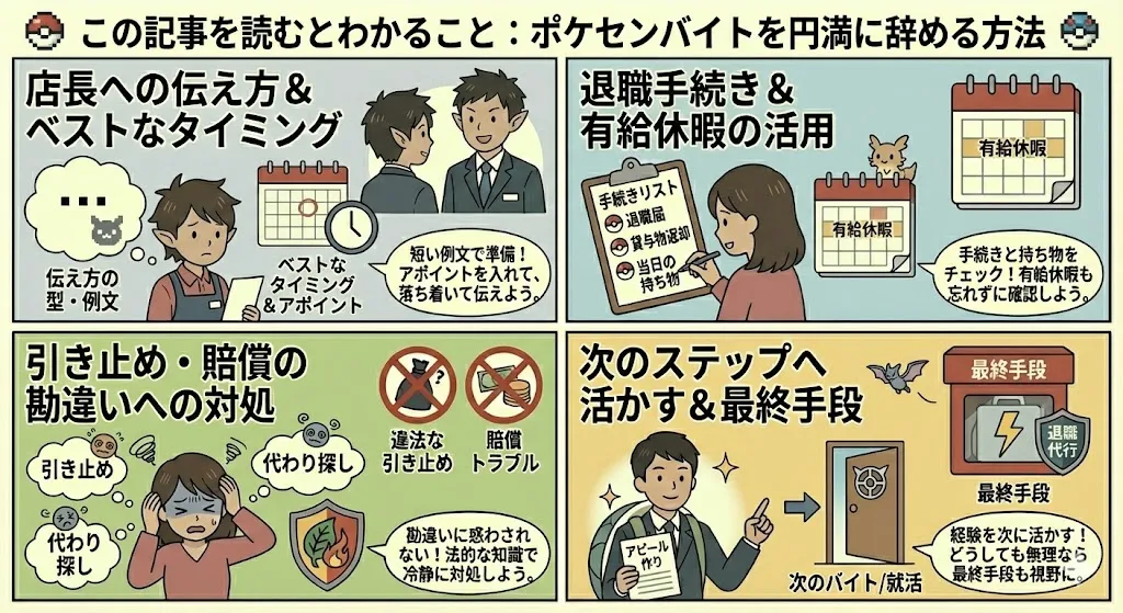 この記事では、検索意図「ポケモンセンター バイト 辞めたい」に沿って、辞めたい理由の言語化・店長への切り出し方・シフトの抜け方・退職手続きの流れを実務的に解説。さらに、有給休暇の使い方や貸与物返却、トラブルを防ぐための注意点までをチェックリスト形式で整理します。どうしても直接言えない・状況が悪化している場合には、最終手段としての退職代行の活用方法も紹介。無理をせず、円満に次の一歩へ進むための現実的ガイドです。