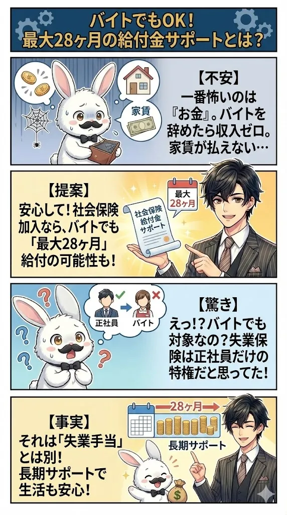 - バイト・フリーターでも「社会保険給付金」で最大28ヶ月の受給を目指せる。