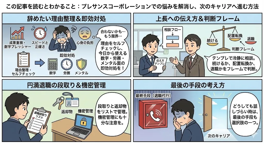 この記事では、辞めたい理由の整理とセルフチェックから、数字・労務・メンタル面の即効対処法、上長や人事への伝え方テンプレまでを解説。さらに、続ける・配置転換・退職の判断フレームと、機密管理に配慮した円満退職の段取り、そして話しづらい場合の最後の手段も紹介します。