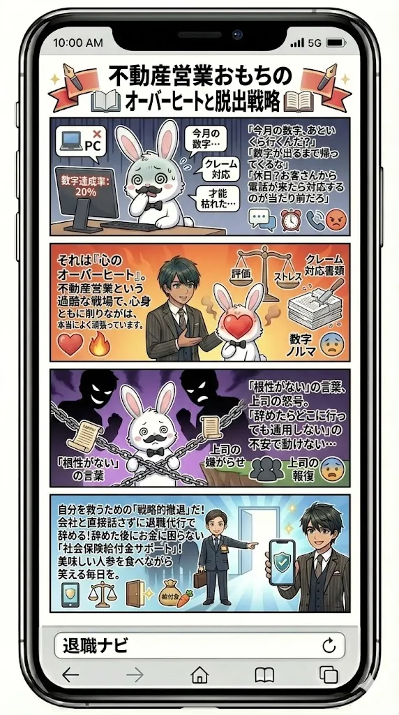 この記事では、不動産営業特有の苦しみから解放されるための客観的な判断基準、そして「もう1日も会社に行きたくない」という方が、今すぐストレスゼロで退職できる方法を詳しく解説します。