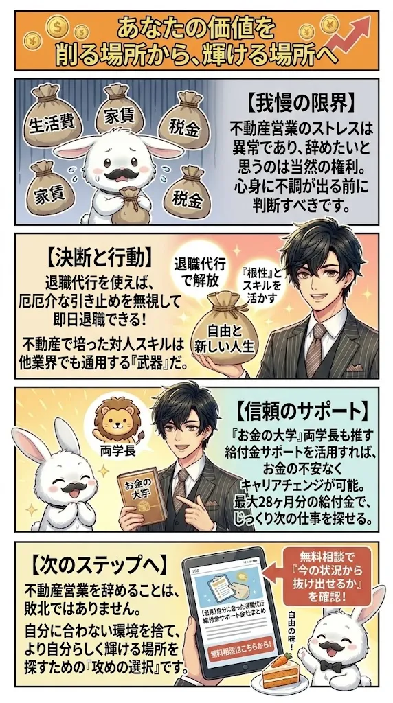不動産営業を辞めることは、敗北ではありません。自分に合わない環境を捨て、より自分らしく輝ける場所を探すための「攻めの選択」です。