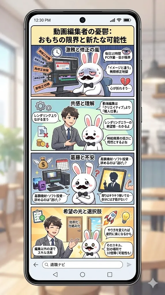 動画編集で培ったあなたの「伝える力」は、場所を変えれば宝石のように輝きます。まずは、酷使した目と体をゆっくり休ませてあげてください。