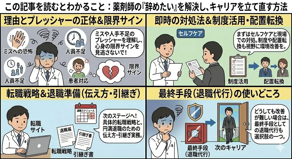 この記事では、まず薬剤師が辞めたいと感じる理由とプレッシャーの正体を整理し、続いて限界サインの見極め方と即時にできるセルフケア・現場の対処法を紹介。さらに、制度活用や配置転換、転職戦略の実践ステップまでを順に解説します。最後に、どうしても改善が難しい場合に備え、退職理由の伝え方・引継ぎ実務・退職代行の利用を検討する際の選択肢までを包括的にまとめます。