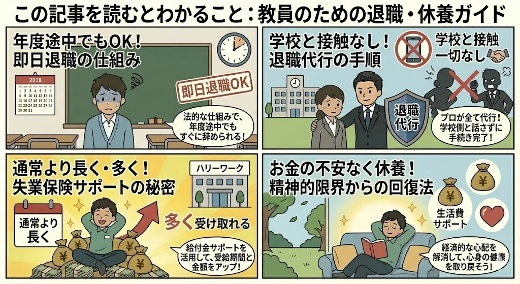 そんな悩みで夜も眠れない先生に向けて、この記事では退職代行を活用したスマートな退職方法と、退職後の生活を守る給付金制度について詳しく解説します。