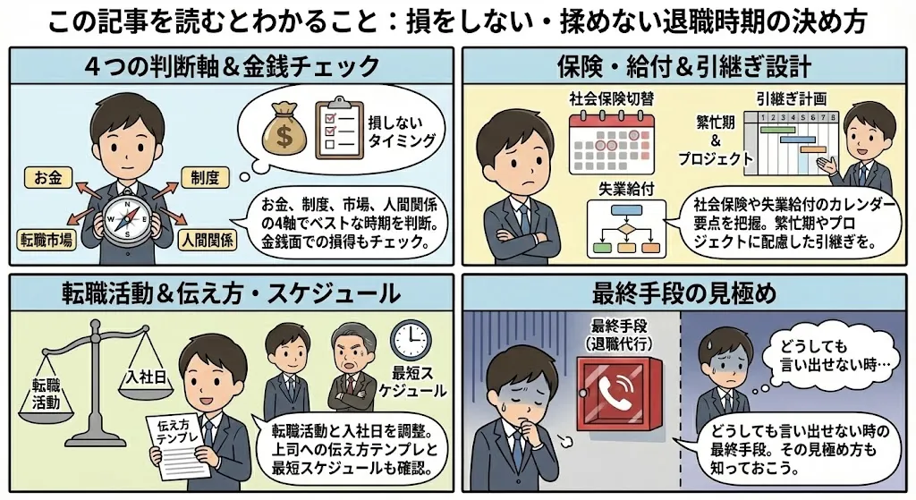 わかるよ。辞める時期って運じゃなくて設計で決めるものなんだ。金銭、社会保険、業務、転職市場――この4つの軸を合わせて、重なりがいちばん良い月を探そう。