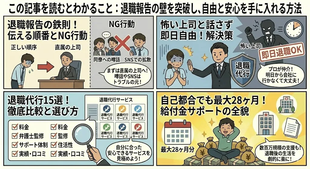 おもち、その悩みは本当に多くの人が抱えていることだよ。退職は伝える相手や順番を一歩間違えると、嫌がらせを受けたり泥沼の引き止めにあったりと、思わぬトラブルに発展することもあるんだ。でも安心して。正しい手順を知れば怖くないし、どうしても自分で言えない時のための「退職代行」や、お金の不安を消す「給付金制度」もちゃんとある。
